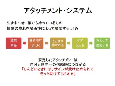「アタッチメント・システム」は、生まれつき動物が誰でも持っている仕組みのことです。情動の崩れ、つまりつらい・苦しいというときに一人でなんとかするのではなく、関係性によって調整しようとする本能的な仕組みを指します。