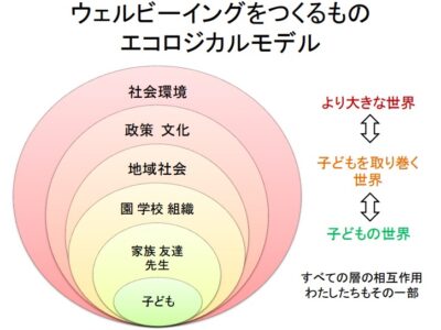 子どもを取り巻く家族・友達・先生、園や学校、いろいろな組織、地域社会の居場所や人、そして子どもに関わる政策や社会の文化、世界中を取り巻く大きな社会環境といったすべての層の相互作用によって子どもたちのウェルビーイングができていくことを「エコロジカルモデル」といいます。