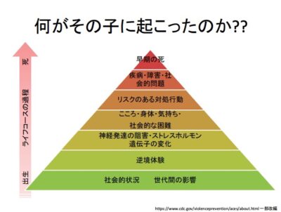 さらに、子ども時代の逆境体験がライフコースを通して将来の心身・社会的なの健康にも関係を及ぼすことが最近の研究で明らかになってきました。