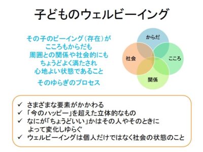 子どものウェルビーイングとは、その子のビーイング、つまり存在そのものが心も身体も周りとの関係や社会的にもその子にとってちょうどよく満たされて心地よい状態であること、そしてそのゆらぎのプロセスのことを指します。