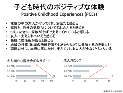 上記のような子ども時代のポジティブな体験がある人ほど、大人になったときに心理社会的なサポートが増えたり成人期のうつが減ったりするといった将来的な影響があるということがわかっています。