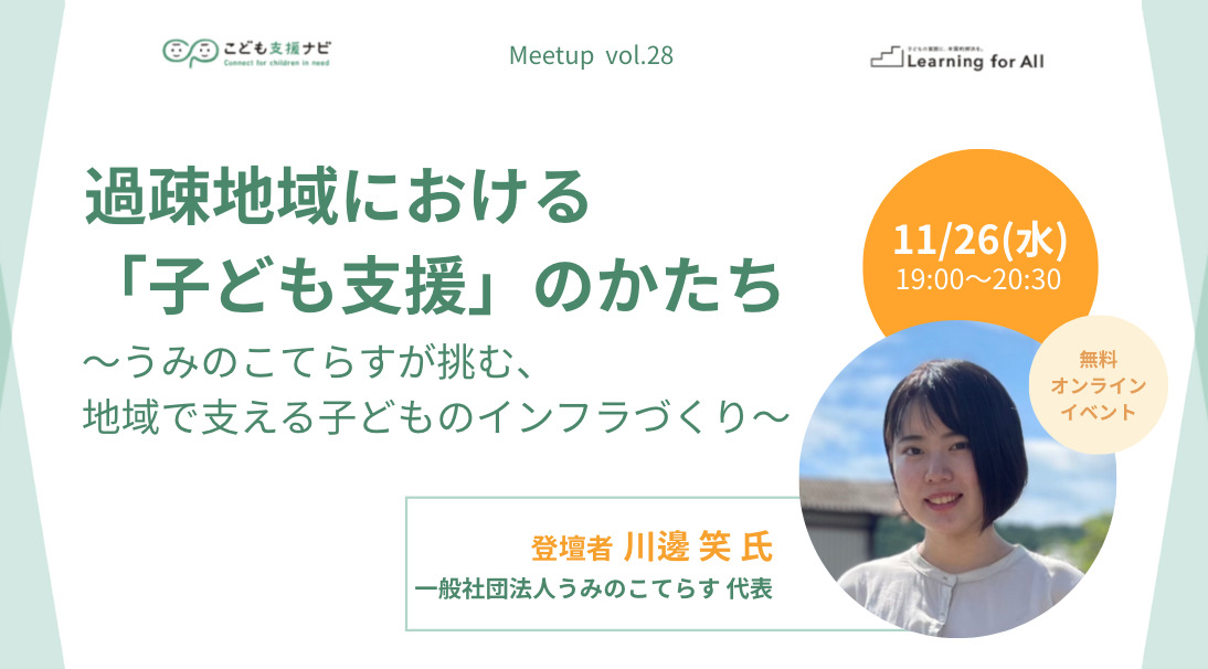 今回は、一般社団法人うみのこてらすの代表である川邊 笑氏をお迎えし、「過疎地域における「子ども支援」のかたち〜うみのこてらすが挑む、地域で支える子どものインフラづくり〜」というテーマで、うみのこてらすの実践や川邊氏の知見・お考えをお話いただきます。
