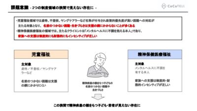 • CoCoTELIでは『精神疾患の親をもつ若者の支援』という社会においてまだ大きく注目されていない領域の支援をおこなっている。