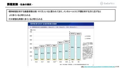 社会の現状として、精神疾患を有する総患者数は増加傾向にあり、現在600万人以上いるとされています。