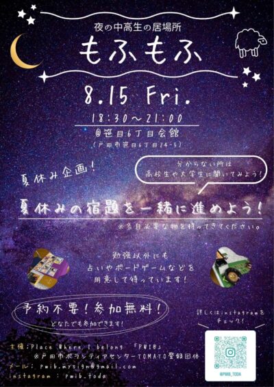 石橋さん)私たちPWIBは、埼玉県戸田市で中高生が夜に過ごせる居場所を作ることを目指し、不定期で19時から21時に町会会館で「もふもふ」という居場所を開いています。「もふもふ」では占いやポーカーなどの楽しめるコンテンツや飲み物・お菓子を毎回用意していて、おしゃべりをしながら自由に過ごせる空間を作っています。さらに、焚火などの特別なコンテンツを準備する場合もあります。
